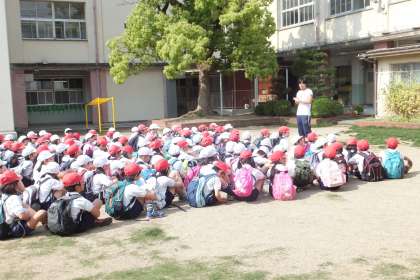 晴天の青空の下、リュックを背負い体操服を着た子どもたちが集合しました。