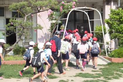 3年生は赤帽、4年生は白帽にして、出発していきました。