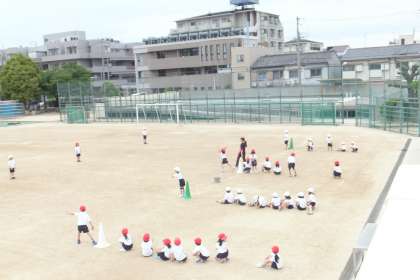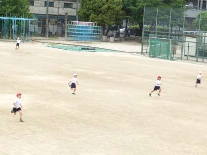 5月12日(月)、空は、どんよりと雲が広がっていましたが、1年生が東運動場で体育の学習を元気にしていました。