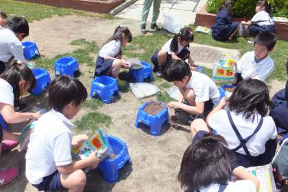 4時限目が始まると、子どもたちは、青いプランターを大切に抱えて、中運動場に出てきました。最初に先生の説明を聞き、培養土をプランターに入れました。やさしくやさしく土をならし、指で5か所に穴を開け、種を一つ一つ入れました。