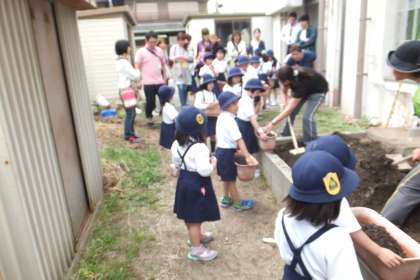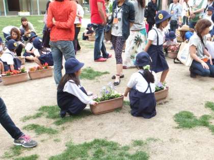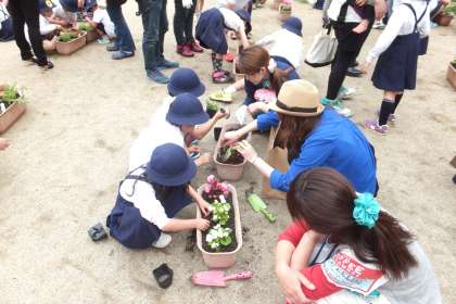 1年生は、生活科で保護者の皆さんと一緒に「花いっぱい運動」を中運動場で行いました。子どもたちはプランターに土を入れてもらい、保護者の皆さんと、ペチュニア、ポーチュラカ、マツバギク、ベゴニア、サルビアの花を植えました。
