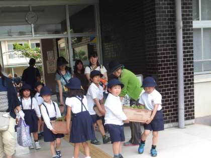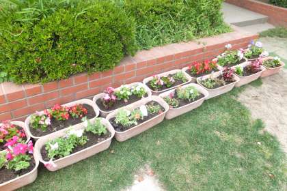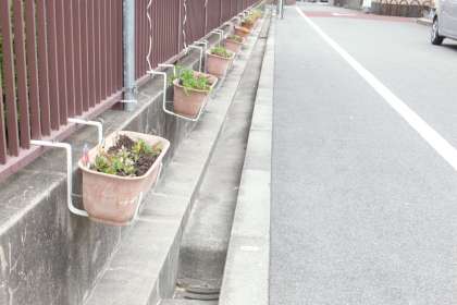 出来上がったプランターを運び、正門沿いのフェンスにかければ、「南百花街道」が出来上がりました。