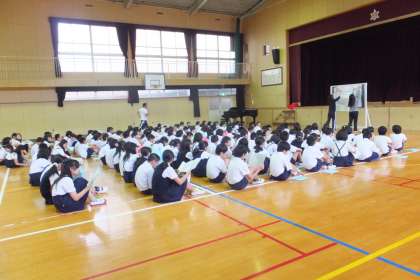 5月16日(金)、昨日の6時限目、5・6年生が一緒に体育館で140周年記念式典で披露する歌の練習を行いました。