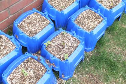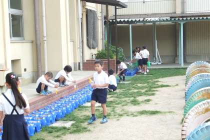 ジョウロやプラスチックの容器で、やさしくやさしく水をあげています。