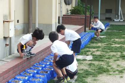 5月20日(火)、1・2年生の子どもたちは、毎朝登校すると、アサガオやミニトマトに水をあげることが日課になっています。