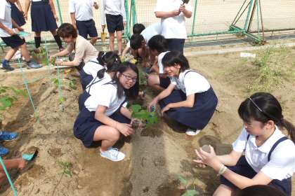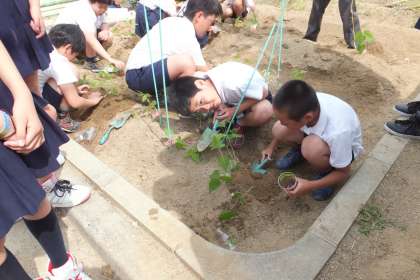 5月20日(火)、5年生が理科の学習でインゲン豆の苗を植えました。