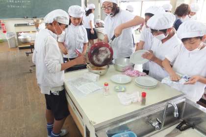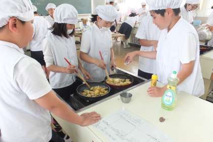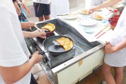 続いて、ジャーマンポテトの班は、ベーコンを加え、味を調えながら、炒めはじめました。オムレツの班は野菜を炒め、玉子と混ぜて焼く班と、焼いた玉子に炒めた野菜を巻く班の2種類の調理法で作りました。