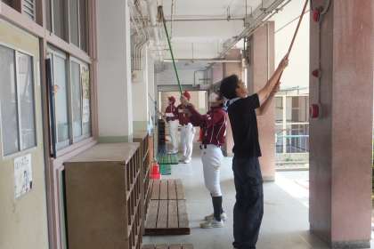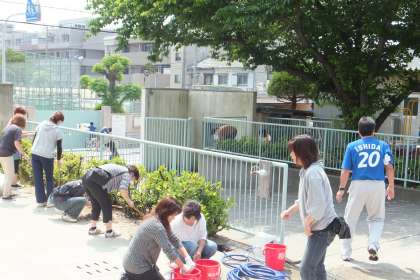 午前10時から、夏を思わせる暑さの中、汗だくになりながら、玄関や1階廊下回り、体育館の、日頃、子供たちの手が届かない高い所のクモの巣や埃まできれいにしていただきました。
