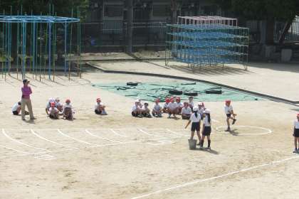 1〜2時限目には、4年生が、ソフトボール投げや50メートル走、反復横跳びの記録をとりました。