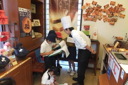ケーキ屋さんでは、お店の中をゆっくり見せていただき、聞いたお話をしっかり、メモをしていました。
