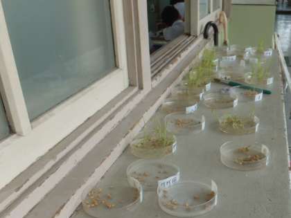 種もみは、ペトリ皿に入れ、芽を出すのをまっていますが、半分ぐらいしか芽が出ていません。苗の方は、順調に育っています。秋の実りが楽しみです!!