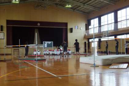 今日の単元は走り高跳びで、「より高く跳ぶための助走のリズムを身につけよう!!」をめあてに授業が進められました。