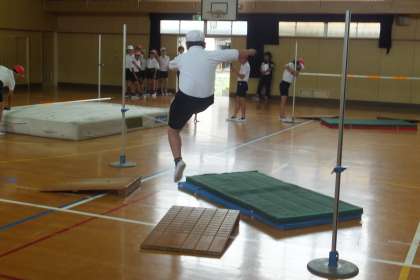 子どもの跳ぶ力に合わせて、跳ぶ場所をかえ、それぞれの記録が伸びるように工夫していました。