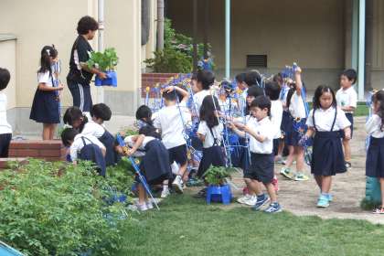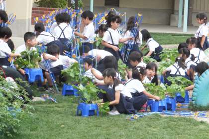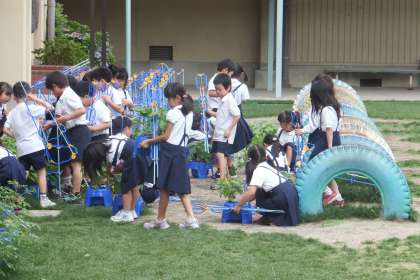 6月12日(木)、1年生がアサガオのプランター支柱を立てました。