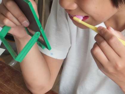 最初に、学校歯科医の先生から、「歯は再生しないから大切にしましょう!!」とお話していただきました。そして、実際に、各自、上下6本の歯を染め、歯磨きの練習をしました。