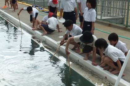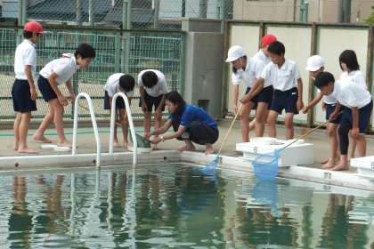 プールで網を使って何かをすくっているようですが、何をしているか、わかりますか??実は、トンボがプールに産みつけたヤゴをとっているんです。