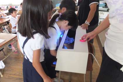 学習内容の説明の後、先生が蛍光塗料を手に吹きかけ、子どもたちは、手をしっかり洗いに行きました。そして、ブラックライトに手をかざすと・・・。洗い残しがバッチリ光っていました。
