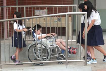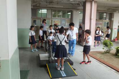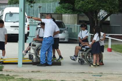 ここでも、スロープや段差では車イスを押す児童も苦労していましたが、乗っている児童も大変です。