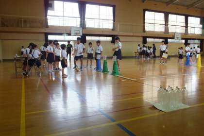 水を入れたペットボトルをピンにして、ボールを蹴って倒します。ワールドカップの選手のようには、うまくいきません!!