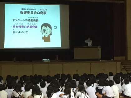 3時間目は、学校保健委員会。保健委員会の発表の後、学校歯科医 藤本先生の講演。ブルーライトやコンタクトと眼鏡の違い等の話をしてくださいました。