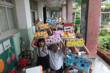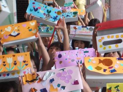 ティッシュの空き箱に、色画用紙や折り紙で飾りをつけ、とてもきれいにできました。みんな、自慢げに自分のバッグをみせてくれました。