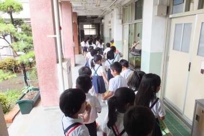 7月3日(木)、1年生が図工の学習で作ったバッグを持って、雨の校内をハイキングしています!!