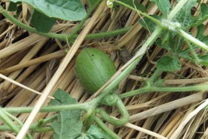 7月4日(金)、飼育栽培委員会では、東運動場の学習園で小玉スイカを栽培しており、ピンポン玉ぐらいの大きさのスイカが出来始めています。