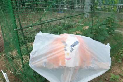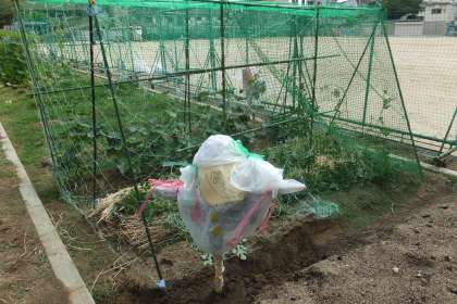 あとは、大きく育ち収穫を待つだけなのですが、どうやら、カラスがそのスイカを狙っているようです。そこで、飼育栽培委員会では、カラスからスイカを守ろうと「かかし」を作りました!!