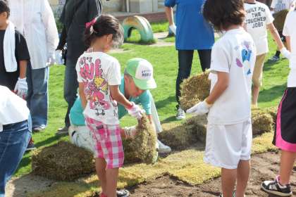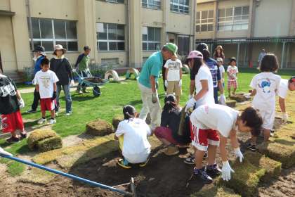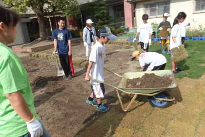 最初に土をならし、たいらにし、芝生を張っていきます。余った土は、男子児童が一輪車で運びました。