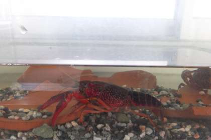 学級で飼育しているアメリカザリガニの絵を描きました。どの作品も真っ赤なザリガニが真っ青な水槽にいる様子がビビッドな色使いで、とても迫力があります!!