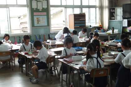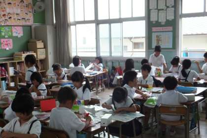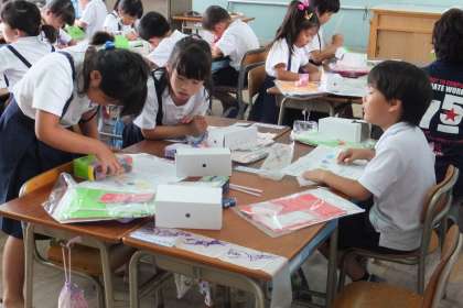この時間は、フワフワポンポンという教材でびっくり箱を作りました。子どもたちは箱から飛び出すフワフワポンポンにマジックを使って絵を描いていました。うまく出来るといいですね!!