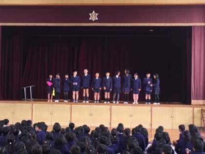 今朝の児童朝会では、代表委員会の子どもたちがあいさつについて劇にして発表しました。