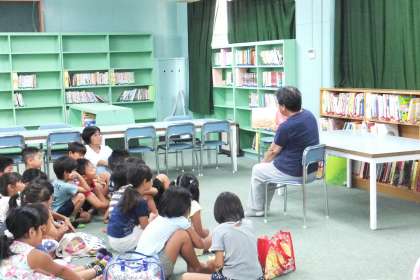 プール開放の前後や学習活動に来ていた子どもたちが参加し、「次はどんなお話しかな??」と、とても楽しそうでした。