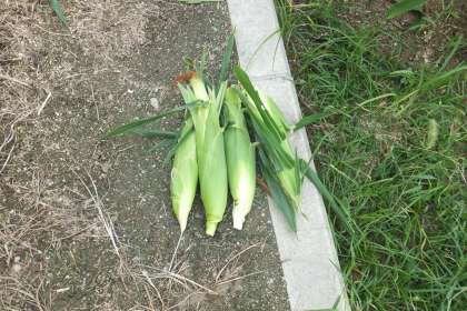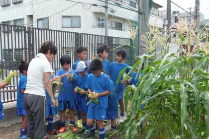 今日は、トウモロコシを収穫し、朝練に来ていた南百F.C.の子どもたちにプレゼントしました。