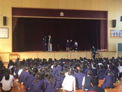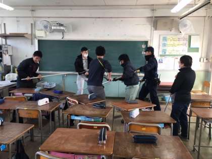 不審者が校内に侵入したという設定で、どのように対処するのかを訓練しました。また、その後は講堂に集まり、警察の方から校外で不審者に出会った際の対応を学びました。