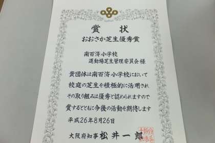 この賞は、子どもたちが芝生の上を走り回ったり転げ回ったりできるようにと、日々芝生の管理をしていただいている地域のグリーンクラブ(芝生管理委員会)の方々に、大阪府から贈られたました。