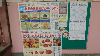 食に関するクイズや給食メニューに出てくる食材について、掲示してあります。夏休みなどの長期休みに入ると、給食のありがたみを強く感じるのは私だけでしょうか?