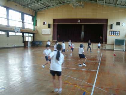 8日(月)中休みの時間に、体育館でドッジボールをしているのは5年2組さんです。