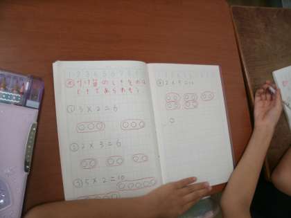 3のかたまりが2つあるのか、2のかたまりが3つあるのか、実生活の場面では意味が違いますよね。その意味までしっかり理解できるよう学習しています。