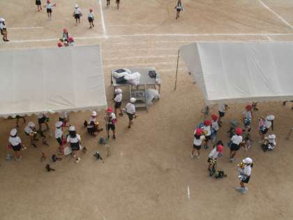 「お茶を飲みましょう。」と指示されて、自分の水筒をめがけて一斉に走り出すところ、お茶を飲みながら一息ついているところ、最初の立ち位置に並び直すところの様子です。