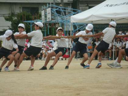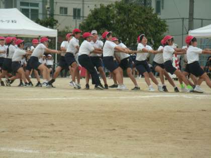 赤白全員の力を合わせて戦った6年生の綱引き。声を掛け合い、力の限りを尽くしました。