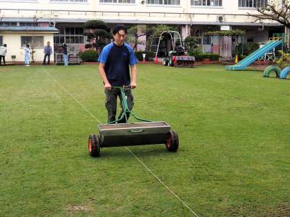 芝生エアレーションとは、芝生に穴を開けて、根に新鮮な空気や水を入れる作業です。また、寒くなる季節を前に、冬芝の種まきも行いました。