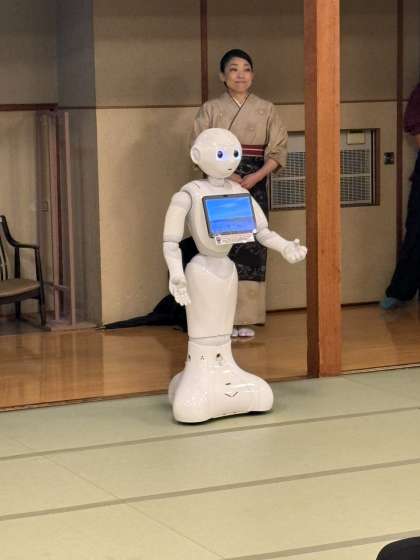 宿舎に到着した一行はペッパー君より歓迎の言葉を受けました。