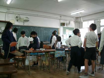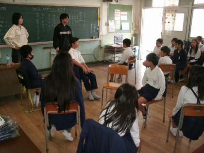 各クラスに2名ずつ劇団員さんが担当してくれました。はじめはどの学級もミニゲームから始めるのですが、担当してくださった劇団員さんによって雰囲気が違います。