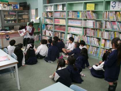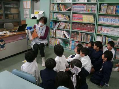 12日(水)、1年1組さんは学校司書の先生による読み聞かせを集中して聞いていました。