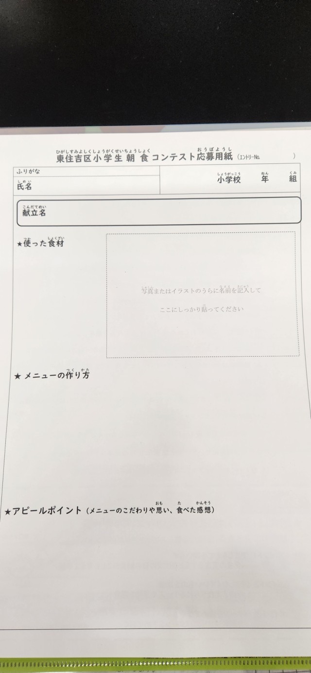 東住吉区の小学生を対象に、1食分の朝食メニューを募集しています。お家の人と一緒に考えてもらってもいいです。
