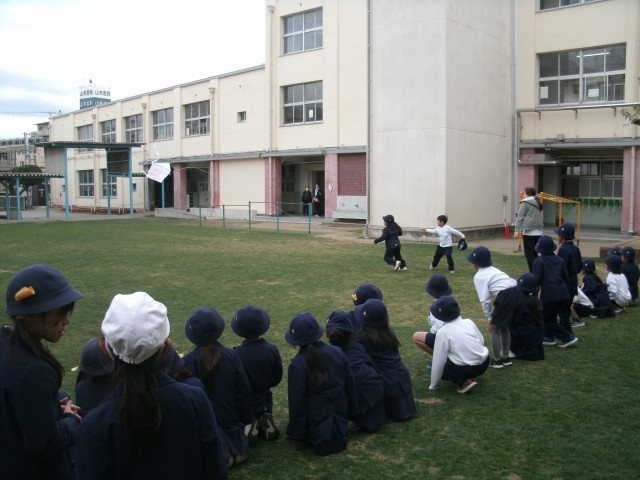 2時間目に東運動場へ出て、全員で凧揚げにチャレンジしたのですが、強風のためうまく揚げることができませんでした。ならばと5時間目に中運動場で再チャレンジ!風はちょうど良い感じで吹いていたので、今度は上手く揚がりました。中運動場では全員が一斉に凧を揚げることはできないので、先生の作った凧で全員順番に体験しました。順番が回ってくると見ていた時の笑顔よりもより一層嬉しそうな顔が見られました。
