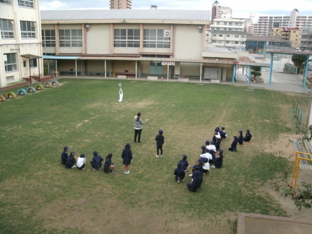 冬らしい天候となった本日、1年3組さんは凧揚げをしていました。