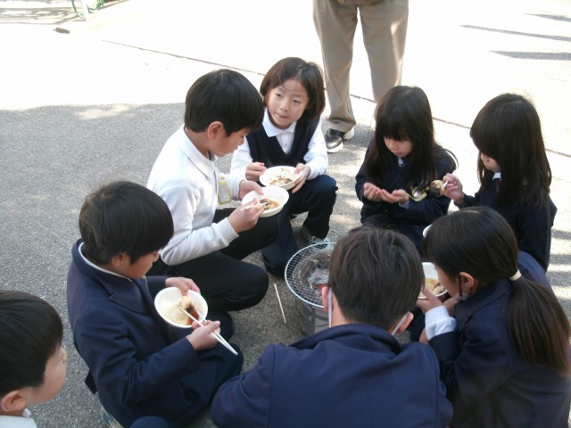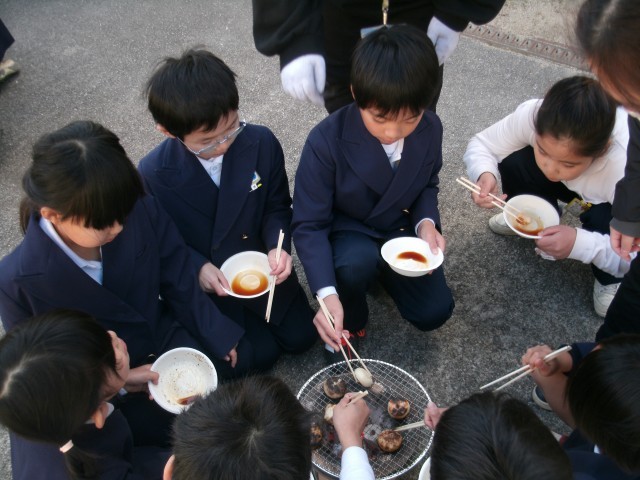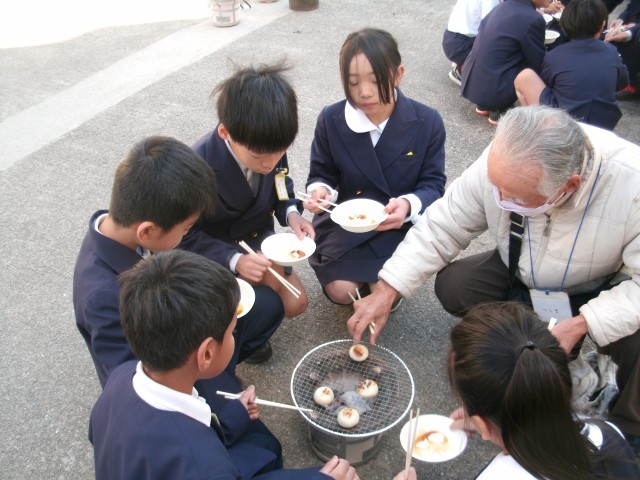 体育館前では、七輪を使っておもち焼きを体験しました。今日はとても寒かったので、なかなか火が起こりずらく、最初に体験したグループはおもちが焼けるのに少し時間がかかりましたが、2回目のグループはあっという間に焼き上がりました。