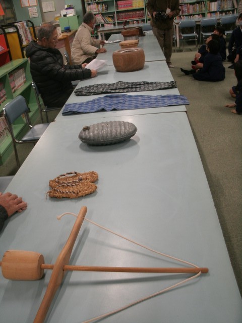 七輪と洗濯板体験を終えた子ども達は、図書室で様々な昔道具を見ながら何に使う道具なのか説明を受けました。町会長の皆さんにとっても古い道具もあり、説明するのも難しそうですが、子ども達が興味を持ってくれるよう楽しく説明してくださいました。
